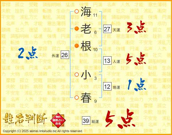 海(11画)老(6画)根(10画) 小(3画)春(9画)