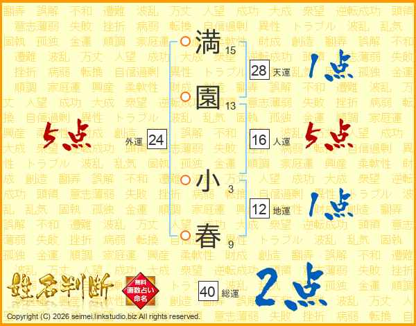 生活面を象徴する運勢です。外部から受ける影響力を表し、結婚運、家庭運や職場、環境への順応性を表します。総運から人運を引いた画数。姓や名が1文字の場合を除く。