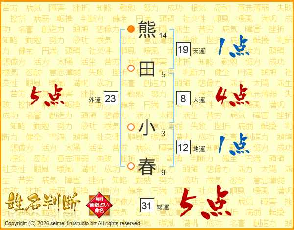 熊田小春さんの総運は31画の5点!