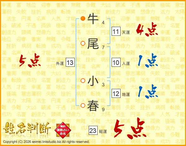 牛尾小春さんの総運は23画の5点!