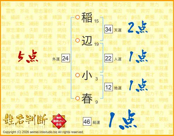 稲(15画)辺(19画) 小(3画)春(9画)