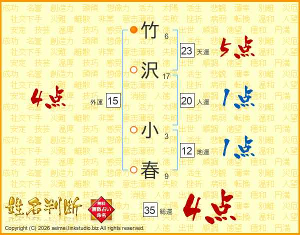 生活面を象徴する運勢です。外部から受ける影響力を表し、結婚運、家庭運や職場、環境への順応性を表します。総運から人運を引いた画数。姓や名が1文字の場合を除く。