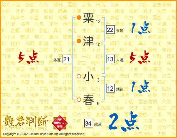生活面を象徴する運勢です。外部から受ける影響力を表し、結婚運、家庭運や職場、環境への順応性を表します。総運から人運を引いた画数。姓や名が1文字の場合を除く。