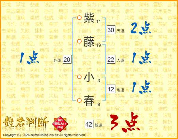 生活面を象徴する運勢です。外部から受ける影響力を表し、結婚運、家庭運や職場、環境への順応性を表します。総運から人運を引いた画数。姓や名が1文字の場合を除く。