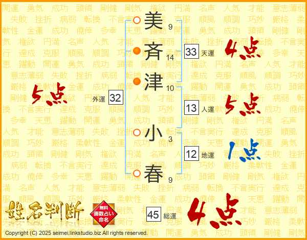 美(9画)斉(14画)津(10画) 小(3画)春(9画)