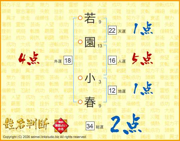 若(9画)園(13画) 小(3画)春(9画)