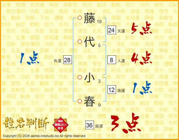 あなたの人生を表す1番重要な運勢です。生涯を通じて影響する総合運となり、主に50歳以降の晩年期に影響を及ぼします。苗字と名前の合計画数。