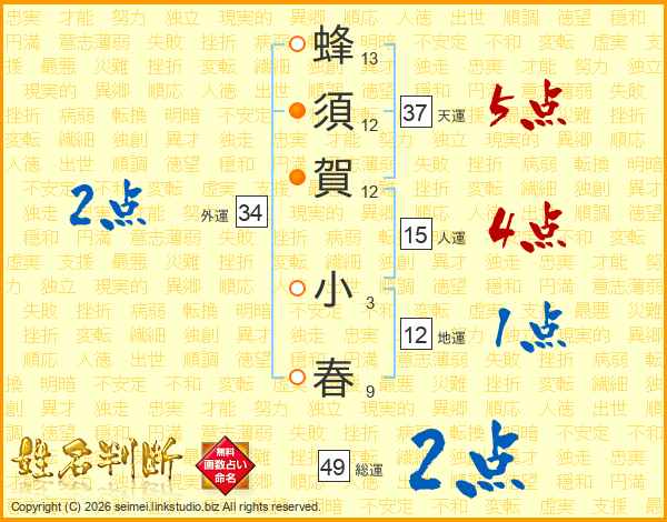 蜂(13画)須(12画)賀(12画) 小(3画)春(9画)