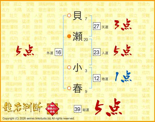 貝瀬小春さんの総運は39画の5点!