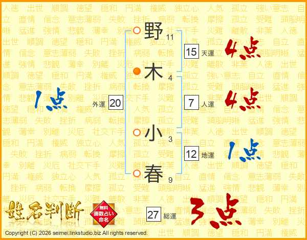野木小春さんの総運は27画の3点!