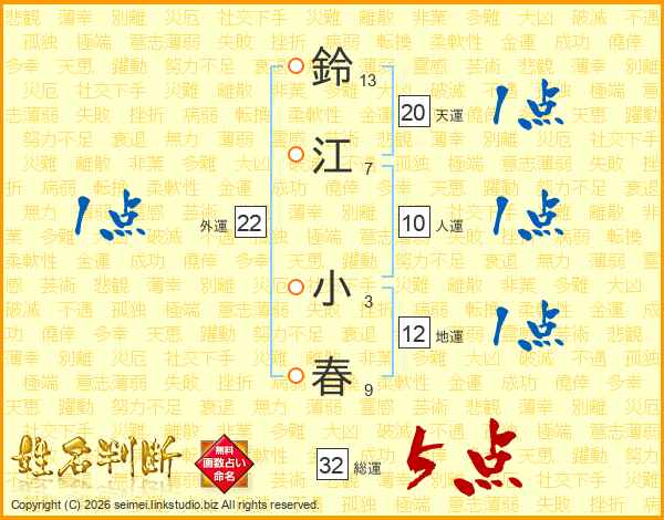 生活面を象徴する運勢です。外部から受ける影響力を表し、結婚運、家庭運や職場、環境への順応性を表します。総運から人運を引いた画数。姓や名が1文字の場合を除く。