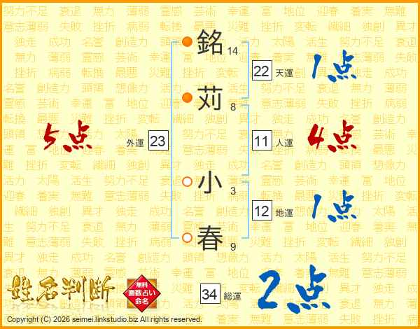 銘(14画)苅(8画) 小(3画)春(9画)
