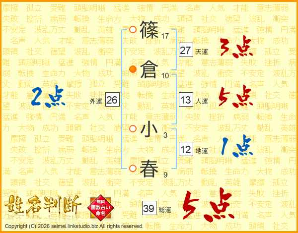篠倉小春さんの総運は39画の5点!
