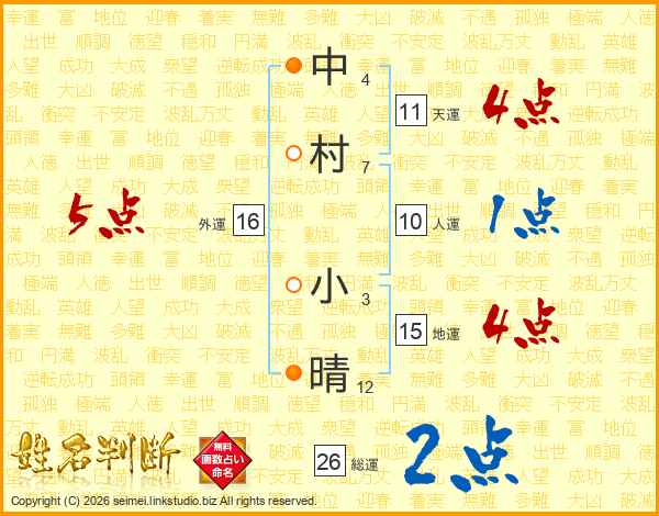 生活面を象徴する運勢です。外部から受ける影響力を表し、結婚運、家庭運や職場、環境への順応性を表します。総運から人運を引いた画数。姓や名が1文字の場合を除く。