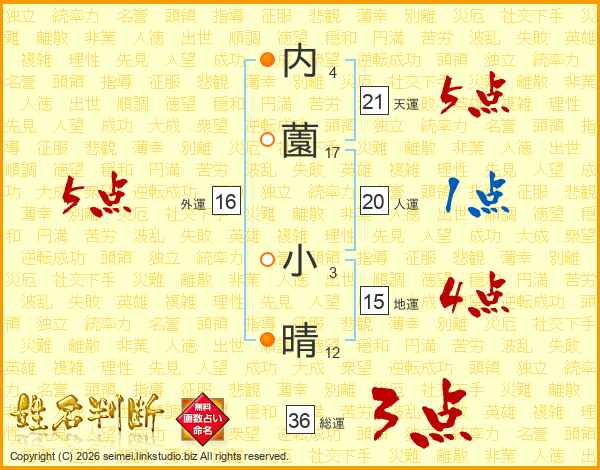 生活面を象徴する運勢です。外部から受ける影響力を表し、結婚運、家庭運や職場、環境への順応性を表します。総運から人運を引いた画数。姓や名が1文字の場合を除く。