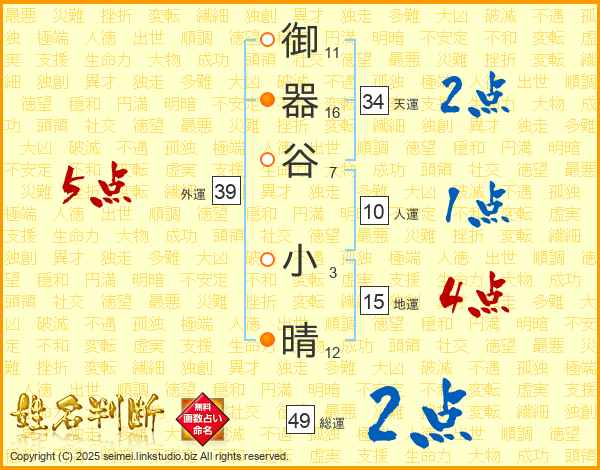 御(11画)器(16画)谷(7画) 小(3画)晴(12画)