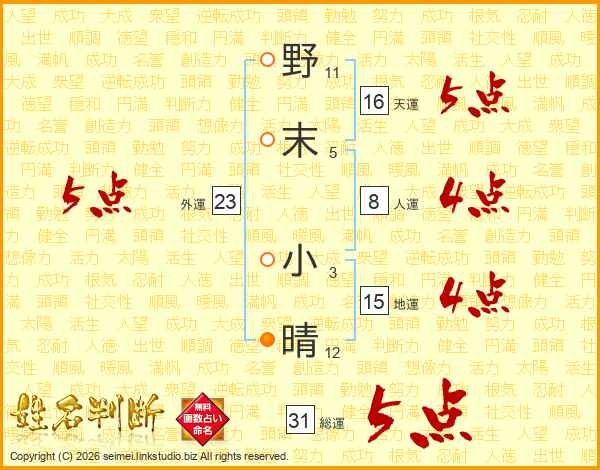 野末小晴さんの総運は31画の5点!
