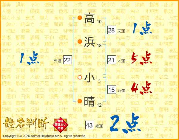 生活面を象徴する運勢です。外部から受ける影響力を表し、結婚運、家庭運や職場、環境への順応性を表します。総運から人運を引いた画数。姓や名が1文字の場合を除く。