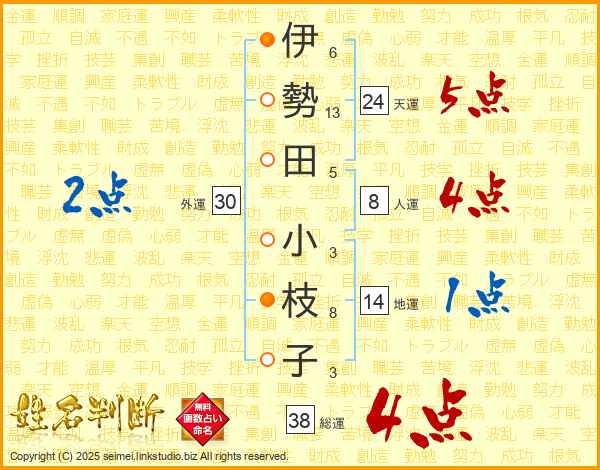伊(6画)勢(13画)田(5画) 小(3画)枝(8画)子(3画)