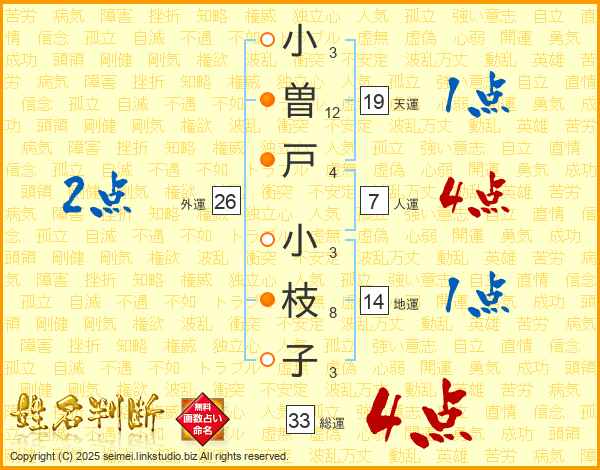 小(3画)曽(12画)戸(4画) 小(3画)枝(8画)子(3画)