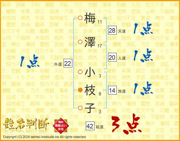 梅(11画)澤(17画) 小(3画)枝(8画)子(3画)
