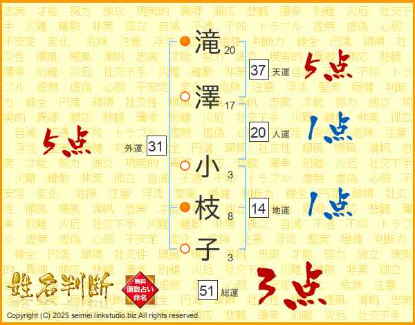 滝澤小枝子さんの総運は51画の3点!