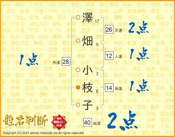 澤(17画)畑(9画) 小(3画)枝(8画)子(3画)