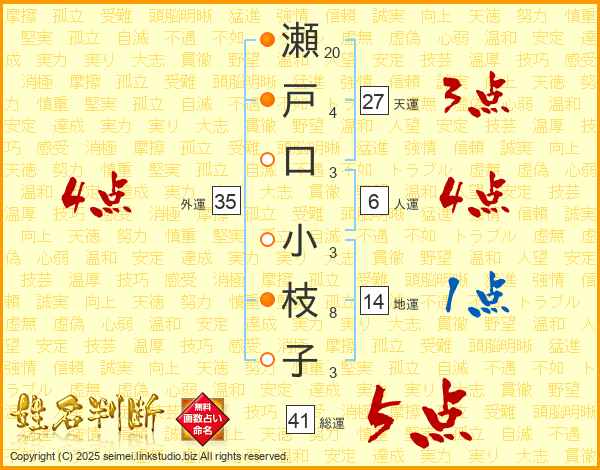 瀬(20画)戸(4画)口(3画) 小(3画)枝(8画)子(3画)