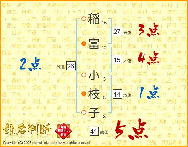 稲(15画)富(12画) 小(3画)枝(8画)子(3画)
