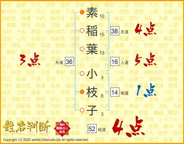 素稲葉小枝子さんの総運は52画の4点!
