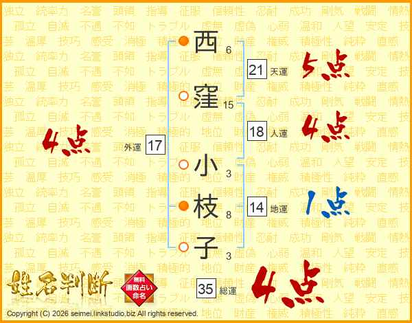 生活面を象徴する運勢です。外部から受ける影響力を表し、結婚運、家庭運や職場、環境への順応性を表します。総運から人運を引いた画数。姓や名が1文字の場合を除く。