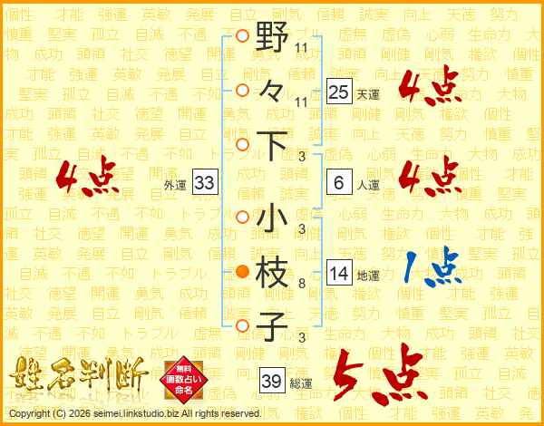 野(11画)々(11画)下(3画) 小(3画)枝(8画)子(3画)