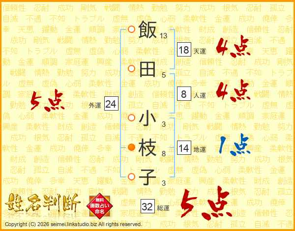 飯(13画)田(5画) 小(3画)枝(8画)子(3画)