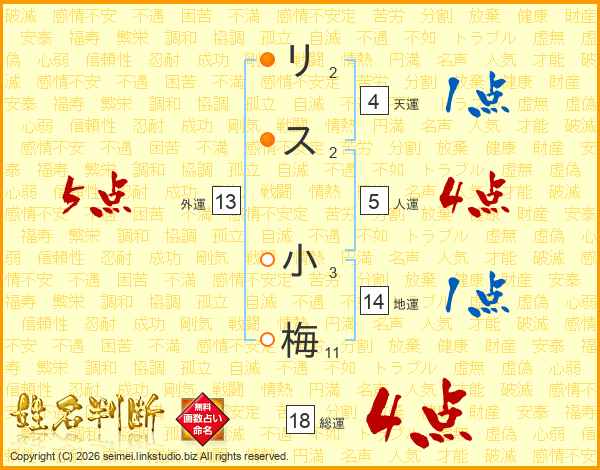 リ(2画)ス(2画) 小(3画)梅(11画)