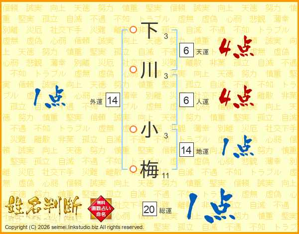 生活面を象徴する運勢です。外部から受ける影響力を表し、結婚運、家庭運や職場、環境への順応性を表します。総運から人運を引いた画数。姓や名が1文字の場合を除く。