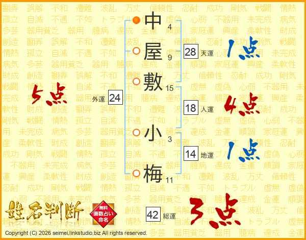 中(4画)屋(9画)敷(15画) 小(3画)梅(11画)