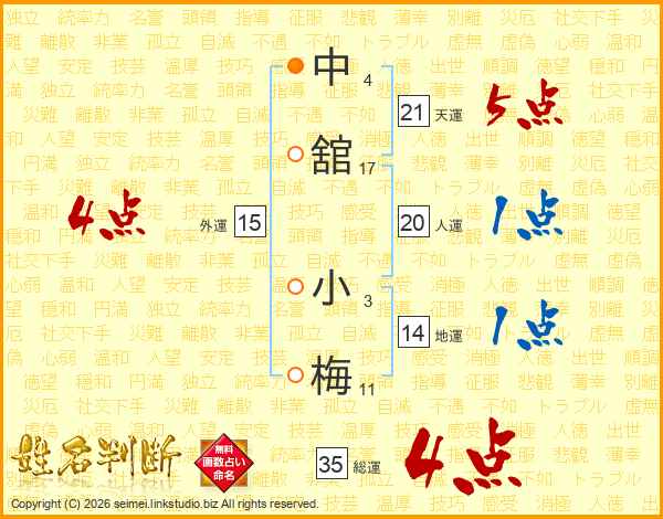 生活面を象徴する運勢です。外部から受ける影響力を表し、結婚運、家庭運や職場、環境への順応性を表します。総運から人運を引いた画数。姓や名が1文字の場合を除く。