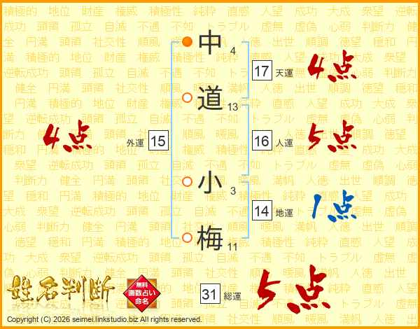 生活面を象徴する運勢です。外部から受ける影響力を表し、結婚運、家庭運や職場、環境への順応性を表します。総運から人運を引いた画数。姓や名が1文字の場合を除く。