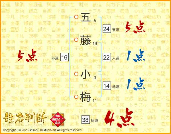 生活面を象徴する運勢です。外部から受ける影響力を表し、結婚運、家庭運や職場、環境への順応性を表します。総運から人運を引いた画数。姓や名が1文字の場合を除く。