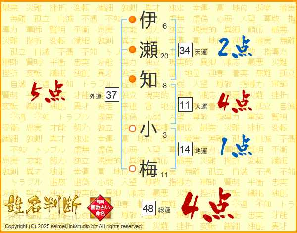 伊(6画)瀬(20画)知(8画) 小(3画)梅(11画)