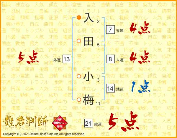 入田小梅さんの総運は21画の5点!