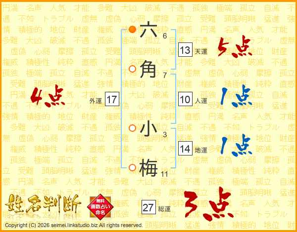 生活面を象徴する運勢です。外部から受ける影響力を表し、結婚運、家庭運や職場、環境への順応性を表します。総運から人運を引いた画数。姓や名が1文字の場合を除く。