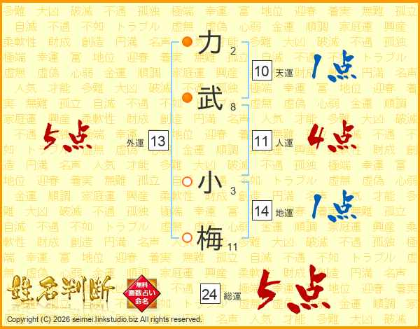 生活面を象徴する運勢です。外部から受ける影響力を表し、結婚運、家庭運や職場、環境への順応性を表します。総運から人運を引いた画数。姓や名が1文字の場合を除く。