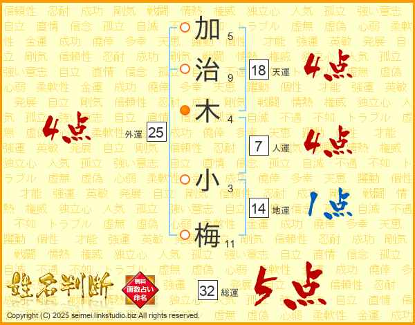 加(5画)治(9画)木(4画) 小(3画)梅(11画)