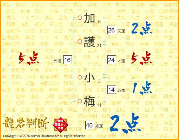生活面を象徴する運勢です。外部から受ける影響力を表し、結婚運、家庭運や職場、環境への順応性を表します。総運から人運を引いた画数。姓や名が1文字の場合を除く。