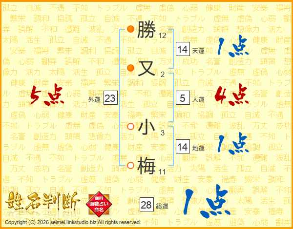 勝(12画)又(2画) 小(3画)梅(11画)