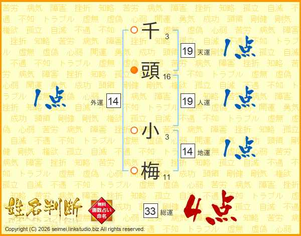 生活面を象徴する運勢です。外部から受ける影響力を表し、結婚運、家庭運や職場、環境への順応性を表します。総運から人運を引いた画数。姓や名が1文字の場合を除く。