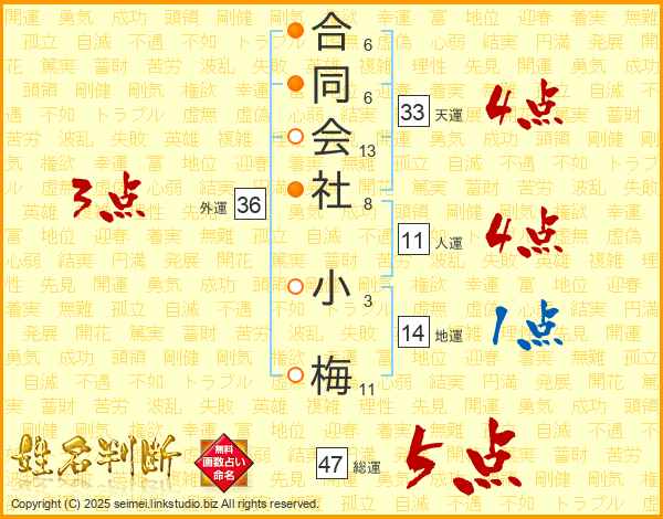 合(6画)同(6画)会(13画)社(8画) 小(3画)梅(11画)