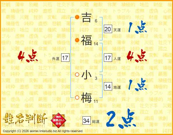 生活面を象徴する運勢です。外部から受ける影響力を表し、結婚運、家庭運や職場、環境への順応性を表します。総運から人運を引いた画数。姓や名が1文字の場合を除く。
