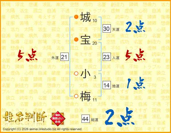 生活面を象徴する運勢です。外部から受ける影響力を表し、結婚運、家庭運や職場、環境への順応性を表します。総運から人運を引いた画数。姓や名が1文字の場合を除く。